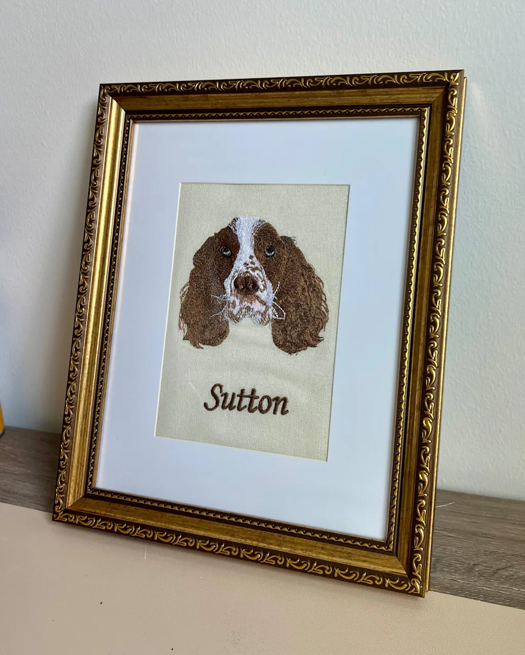 A personalized embroidered portrait of your pet, each design is stitched to resemble your pet as closely as possible, though some color and detail variation may occur due to the nature of embroidery.